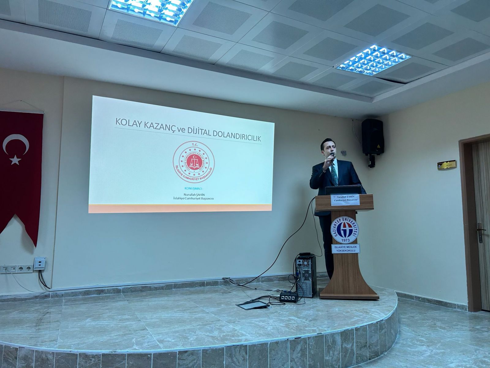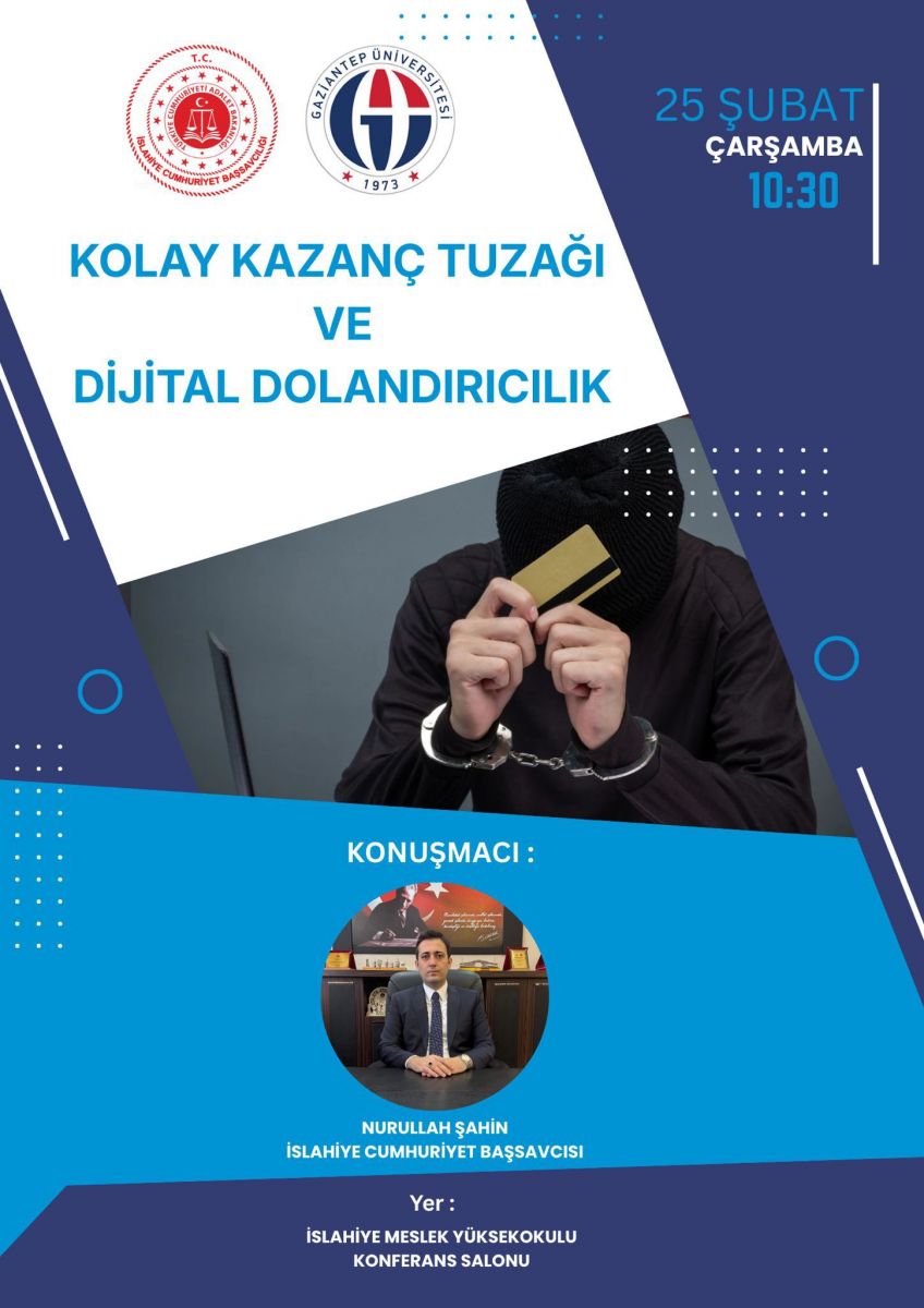 İslahiye Cumhuriyet Başsavcısı Nurullah Şahin, İslahiye Meslek Yüksekokulu Konferans Salonu’nda düzenlenen programda öğrencilerle bir araya gelerek “Kolay Kazanç ve Dijital Dolandırıcılık” konulu bilgilendirme toplantısı gerçekleştirdi.